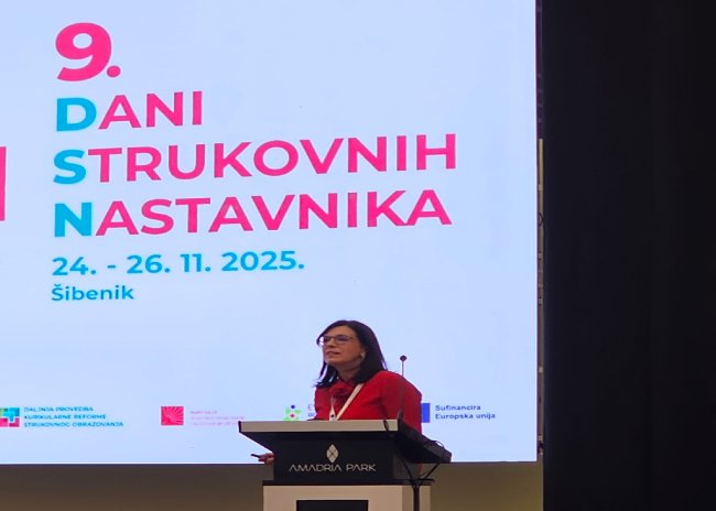 Na ovogodišnjim 9. Danima strukovnih nastavnika naša je škola još jednom potvrdila kvalitetu i predanost radu u strukovnom obrazovanju. Naša nastavnica Suzana Mikulić sudjelovala je s izlaganjem „Odgovornost, suradnja i komunikacija u modularnoj nastavi – iskustvo iz modula IKT u uredskom poslovanju“, u kojem je predstavila konkretne primjere dobre prakse te potvrdila da se modularna nastava u našoj školi uspješno i kvalitetno provodi. Posebno je istaknula važnost timskog rada nastavnika, jasne komunikacije te aktivne uloge učenika u učenju, što su ključni elementi suvremene modularne nastave. Primjeri iz modula IKT u uredskom poslovanju prikazali su kako se učenicima omogućuje razvoj digitalnih, organizacijskih i komunikacijskih kompetencija koje su im potrebne za tržište rada.