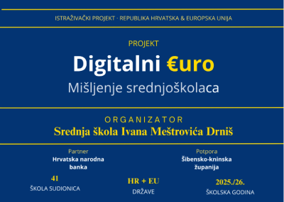 Maturanti ekonomskog usmjerenja sudjelovali su u međunarodnom projektu “Digitalni euro – mišljenje srednjoškolaca” te i na ovaj način obilježili Svjetski tjedan novca 2026. u ožujku ove godine. Također, maturanti su 18. ožujka 2026. pratili događaj na YouTube kanalu Financijska pismenost – Global Money Week 2026. – Konferencija financijske pismenosti Ministarstva financija „MUDRO DANAS, SIGURNO SUTRA!”.Uz organizirana online predavanja stručnjaka iz HNB-a za naše učenike tijekom listopada i studenog 2025. provedeno je istraživanje o mišljenju srednjoškolaca u vezi s uvođenjem digitalnog eura, naši učenici pokazali su angažman i entuzijazam a rezultat provedenih aktivnosti je vrijedno iskustvo za sve nas.O samom projektu, projektnim aktivnostima i rezultatima istraživanja možemo pročitati na službenoj stranici Projekta:Financijska pismenost je tema Državnog sajma vježbeničkih tvrtki: “Financijsko znanje za uspješno poslovanje”, koji se održava 10. travnja 2026. u Ekonomskoj i upravnoj školi, Split.Panel rasprava bit će organizirana istoga dana u školi, to je stručni skup na državnoj razini koji će se održati hibridno a naslov je „Financije nisu zagonetka – već vještina“.