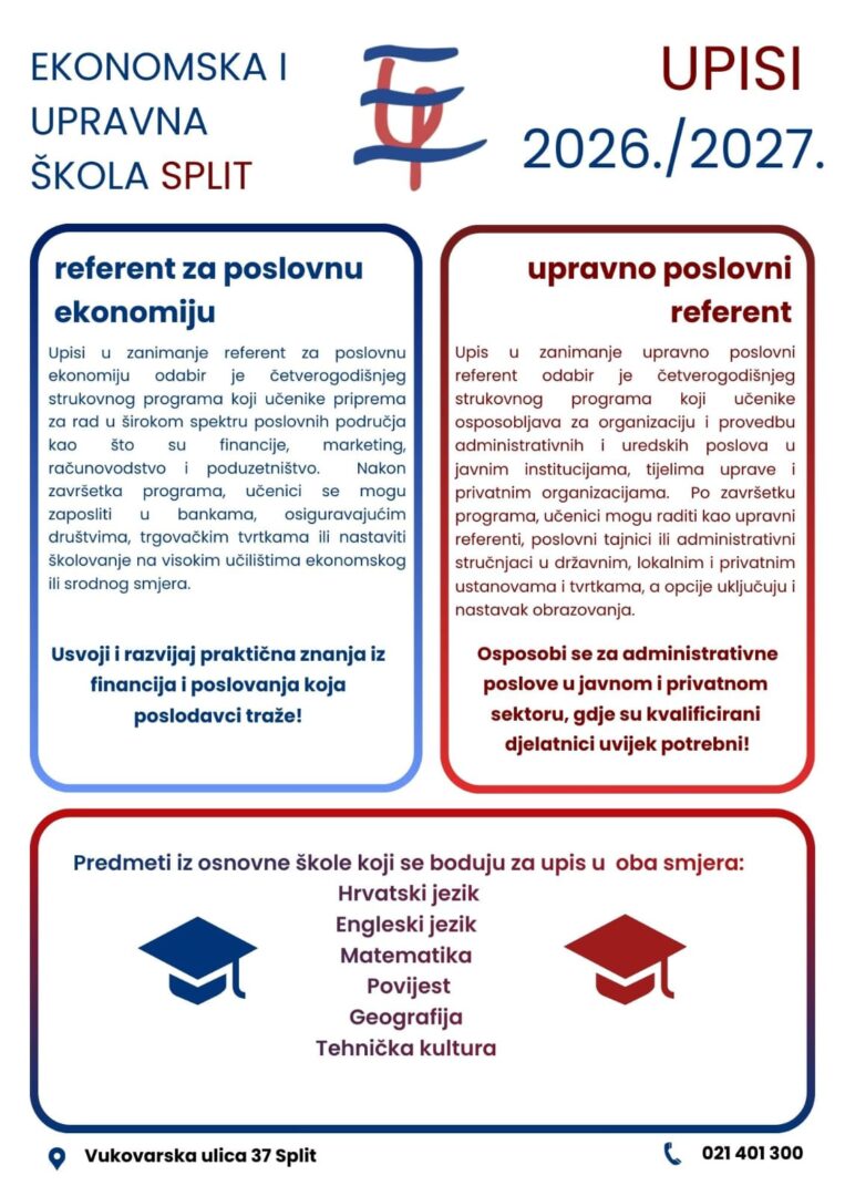 Upravni referent i Poslovni tajnik postaju Upravno-poslovni referent / Upravno-poslovna referentica (upisujemo 4 odjeljenja, 96 učenika)
